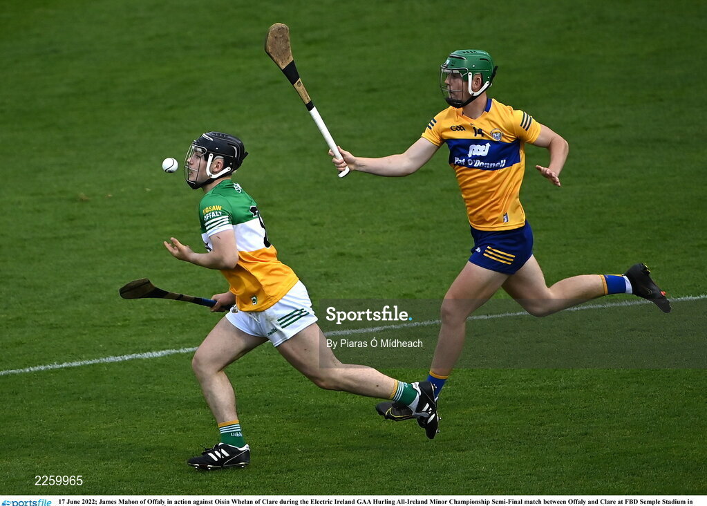 17 June 2022; James Mahon of Offaly in action against Oisín Whelan of Clare during the Electric Ireland GAA Hurling All-Ireland Minor Championship Semi-Final match between Offaly and Clare at FBD Semple Stadium in Thurles, Tipperary. Photo by Piaras Ó Mídheach/Sportsfile