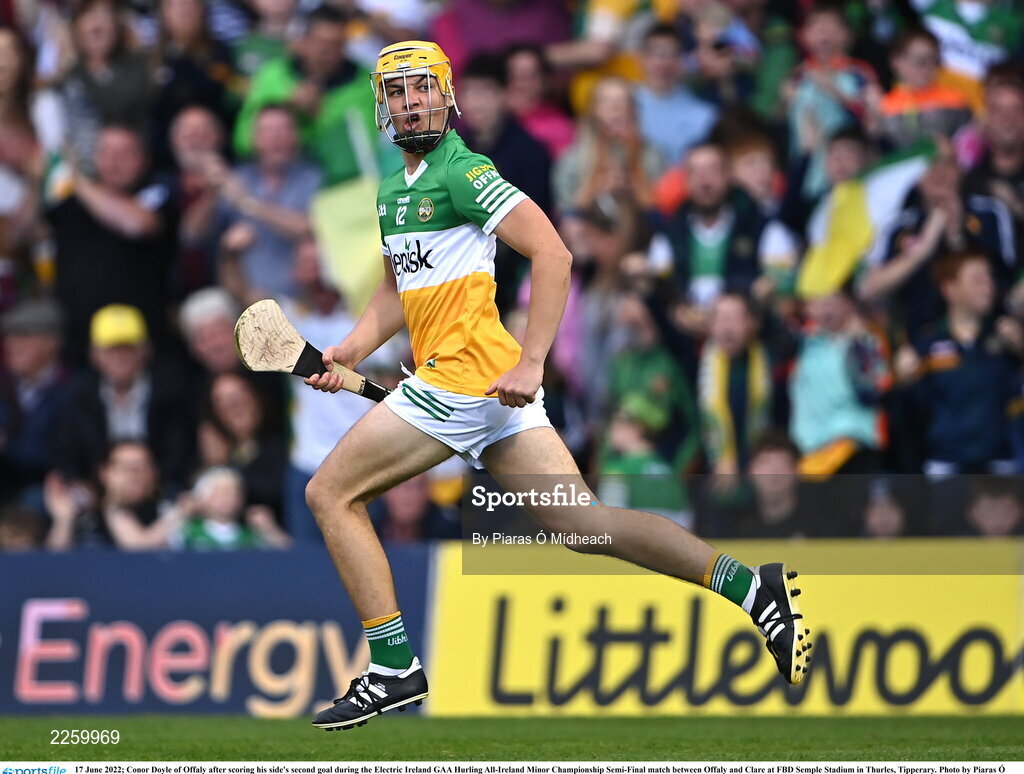 17 June 2022; Conor Doyle of Offaly after scoring his side's second goal during the Electric Ireland GAA Hurling All-Ireland Minor Championship Semi-Final match between Offaly and Clare at FBD Semple Stadium in Thurles, Tipperary. Photo by Piaras Ó Mídheach/Sportsfile