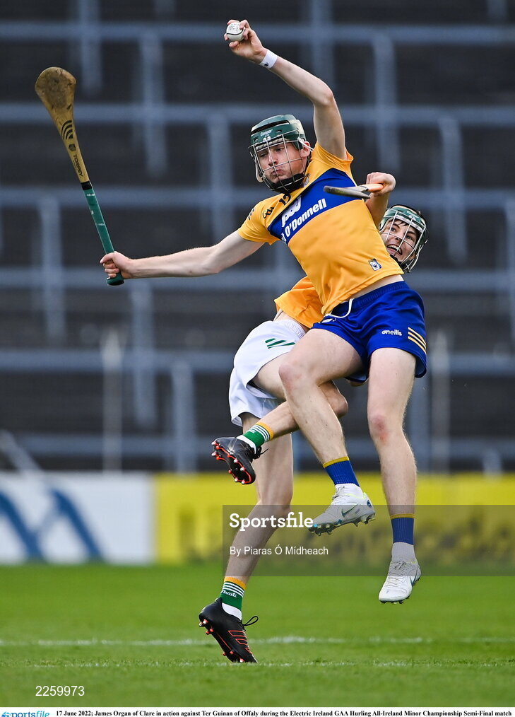 17 June 2022; James Organ of Clare in action against Ter Guinan of Offaly during the Electric Ireland GAA Hurling All-Ireland Minor Championship Semi-Final match between Offaly and Clare at FBD Semple Stadium in Thurles, Tipperary. Photo by Piaras Ó Mídheach/Sportsfile