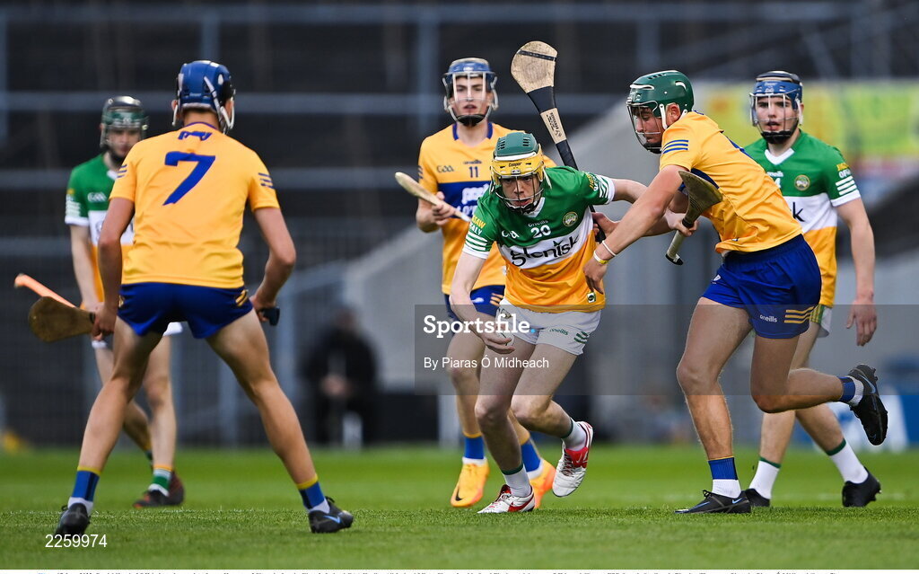 17 June 2022; Daniel Hand of Offaly in action against James Hegarty of Clare during the Electric Ireland GAA Hurling All-Ireland Minor Championship Semi-Final match between Offaly and Clare at FBD Semple Stadium in Thurles, Tipperary. Photo by Piaras Ó Mídheach/Sportsfile