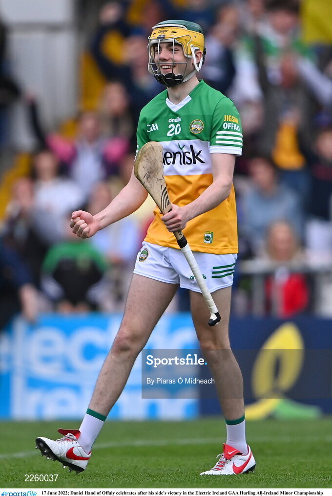 17 June 2022; Daniel Hand of Offaly celebrates after his side's victory in the Electric Ireland GAA Hurling All-Ireland Minor Championship Semi-Final match between Offaly and Clare at FBD Semple Stadium in Thurles, Tipperary. Photo by Piaras Ó Mídheach/Sportsfile