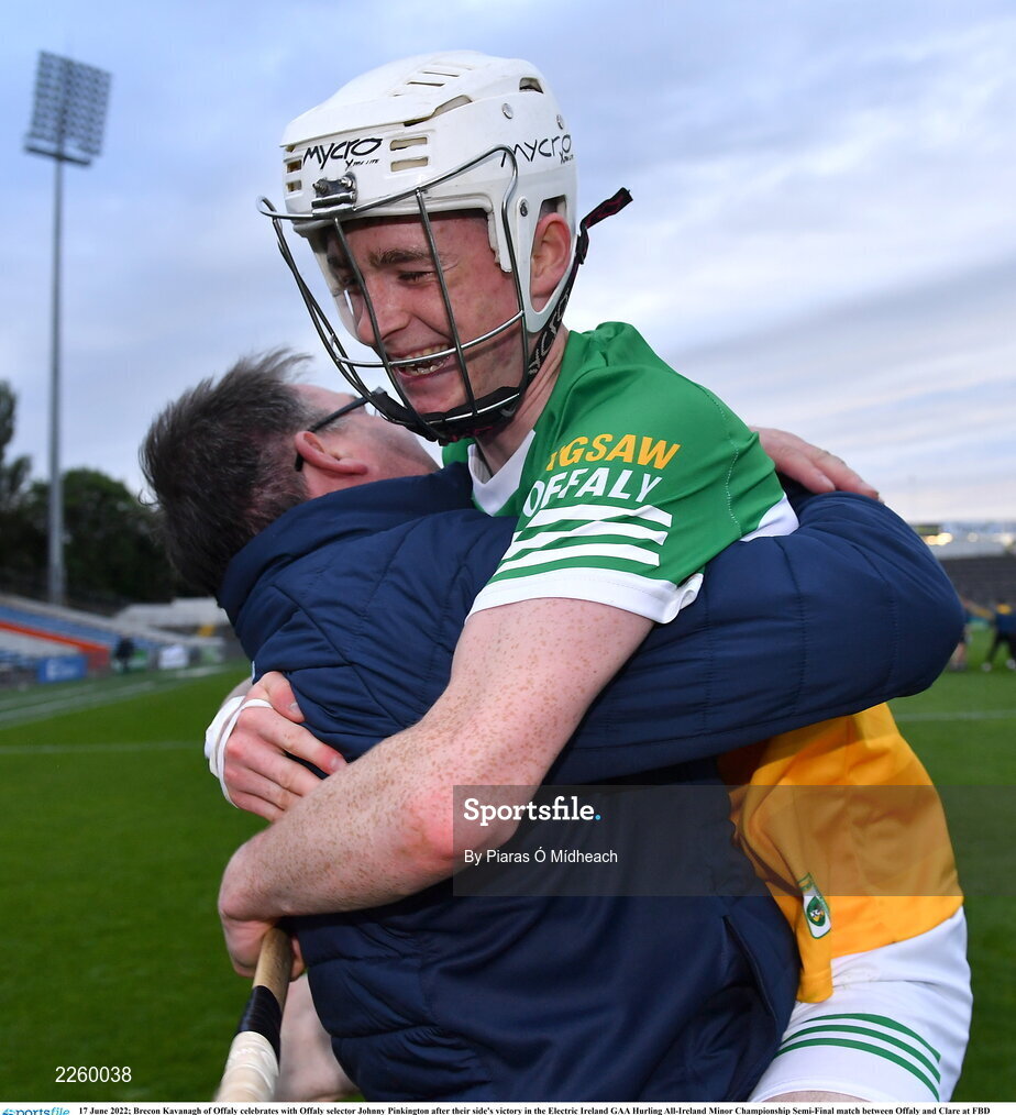 17 June 2022; Brecon Kavanagh of Offaly celebrates with Offaly selector Johnny Pinkington after their side's victory in the Electric Ireland GAA Hurling All-Ireland Minor Championship Semi-Final match between Offaly and Clare at FBD Semple Stadium in Thurles, Tipperary. Photo by Piaras Ó Mídheach/Sportsfile