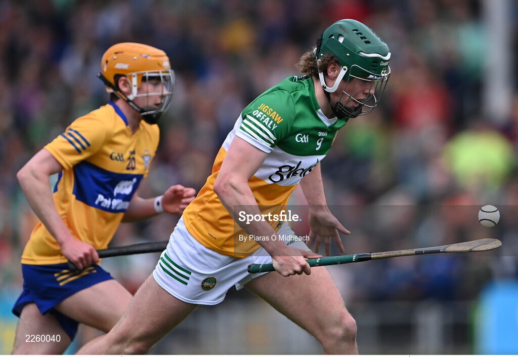17 June 2022; Cillian Martin of Offaly gets away from Piaras Ó Sé of Clare during the Electric Ireland GAA Hurling All-Ireland Minor Championship Semi-Final match between Offaly and Clare at FBD Semple Stadium in Thurles, Tipperary. Photo by Piaras Ó Mídheach/Sportsfile