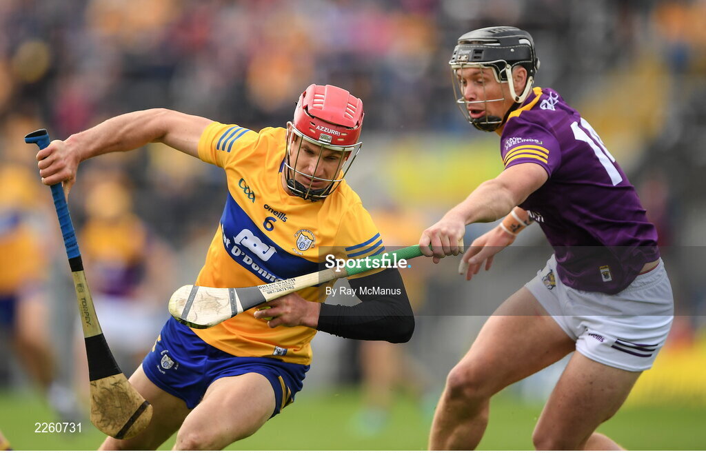 18 June 2022; John Conlon of Clare is tackled by Conor McDonald of Wexford during the GAA Hurling All-Ireland Senior Championship Quarter-Final match between Clare and Wexford at the FBD Semple Stadium in Thurles, Tipperary. Photo by Ray McManus/Sportsfile