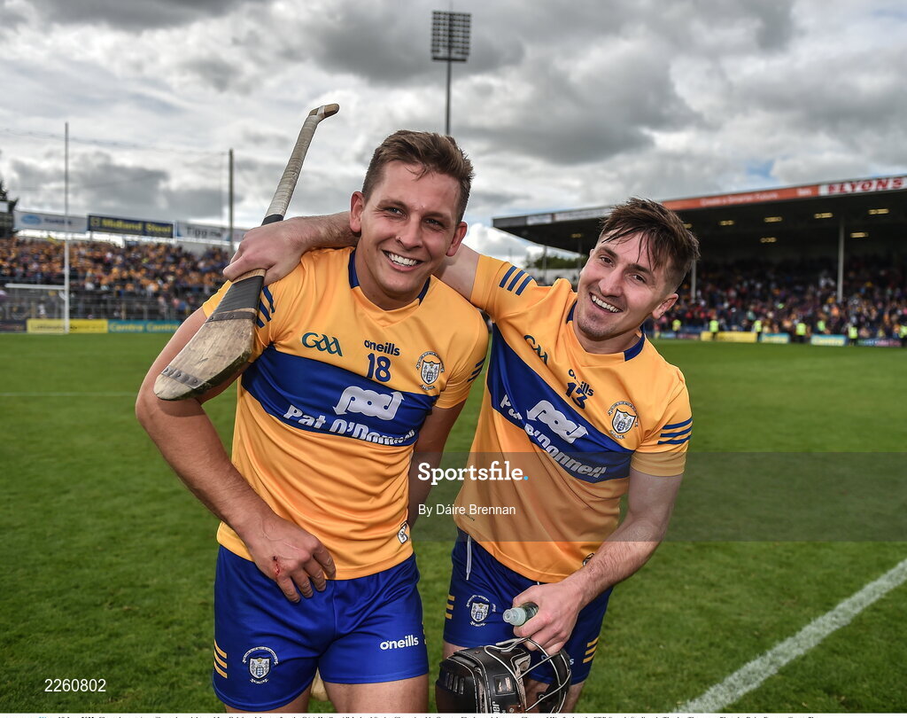 18 June 2022; Clare players, Aron Shanagher, right, and Ian Galvin celebrate after the GAA Hurling All-Ireland Senior Championship Quarter-Final match between Clare and Wexford at the FBD Semple Stadium in Thurles, Tipperary. Photo by Daire Brennan/Sportsfile