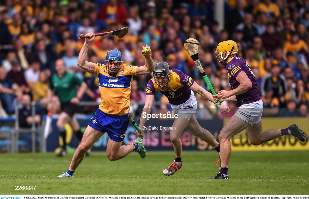 18 June 2022; Shane O'Donnell of Clare in action against Diarmuid O'Keeffe of Wexford during the GAA Hurling All-Ireland Senior Championship Quarter-Final match between Clare and Wexford at the FBD Semple Stadium in Thurles, Tipperary. Photo by Daire Brennan/Sportsfile