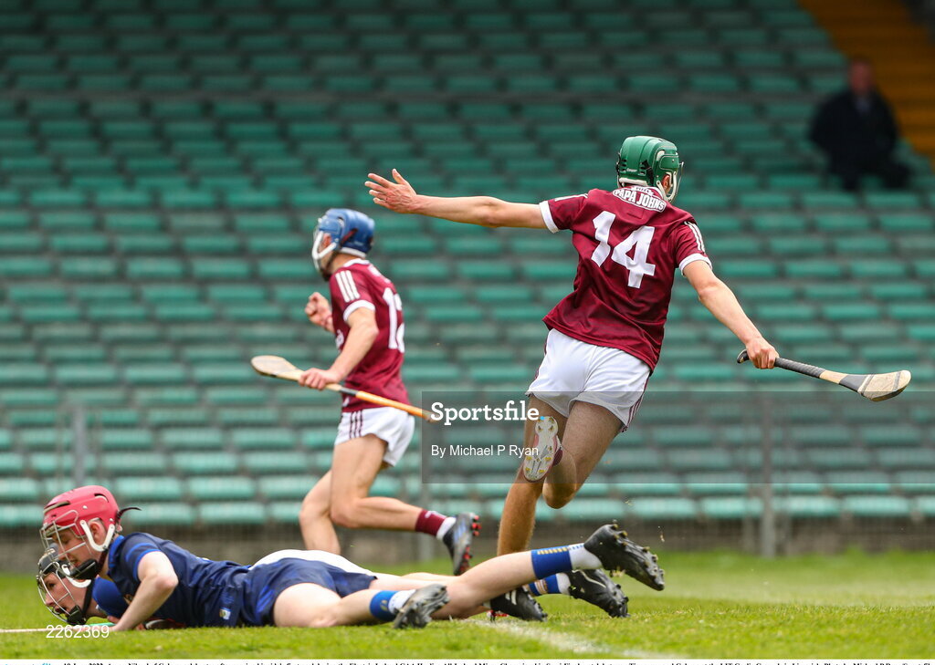 19 June 2022; Aaron Niland of Galway celebrates after scoring his side's first goal during the Electric Ireland GAA Hurling All-Ireland Minor Championship Semi-Final match between Tipperary and Galway at the LIT Gaelic Grounds in Limerick. Photo by Michael P Ryan/Sportsfile