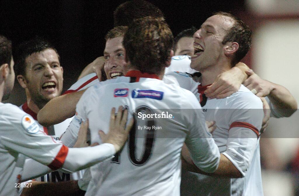 20 October 2006; Dundalk's Philip Hughes, 3rd from left, celebrates with team mates after scoring a goal. eircom League, Division 1, Galway United v Dundalk, Terryland Park, Galway. Picture credit: Ray Ryan / SPORTSFILE
