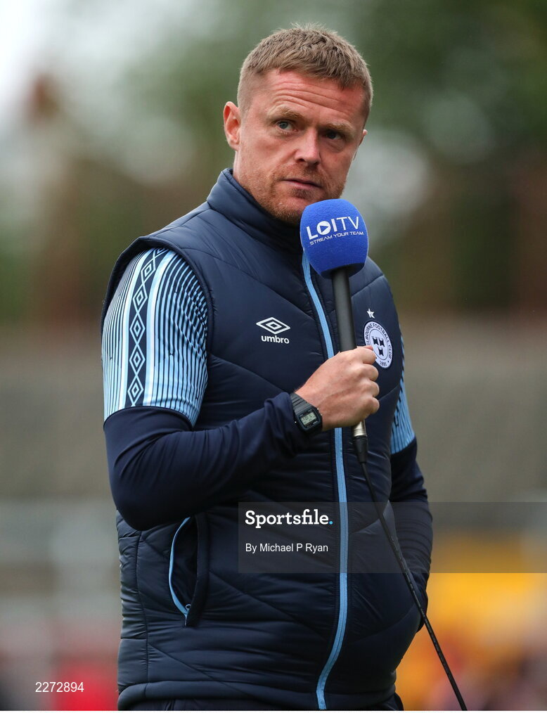 24 June 2022; Shelbourne manager Damien Duff is interviewed by LOI TV before the SSE Airtricity League Premier Division match between Shelbourne and Dundalk at Tolka Park in Dublin. Photo by Michael P Ryan/Sportsfile