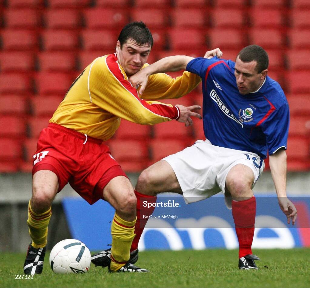 28 October 2006; Ryan McCluskey, Dungannon Swifts, in action against Mark Dickson, Linfield. Carnegie Premier League, Linfield v Dungannon Swifts, Windsor Park, Belfast. Picture credit: Oliver McVeigh / SPORTSFILE
