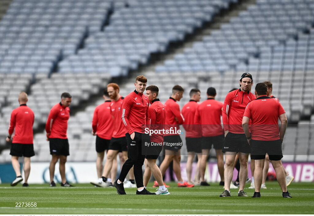 25 June 2022; Derry players walk the pitch before the GAA Football All-Ireland Senior Championship Quarter-Final match between Clare and Derry at Croke Park, Dublin. Photo by David Fitzgerald/Sportsfile