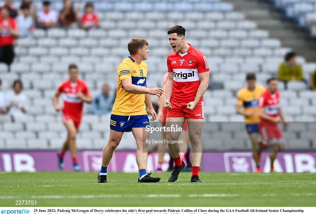 25 June 2022; Pádraig McGrogan of Derry celebrates his side's first goal towards Pádraic Collins of Clare during the GAA Football All-Ireland Senior Championship Quarter-Final match between Clare and Derry at Croke Park, Dublin. Photo by David Fitzgerald/Sportsfile
