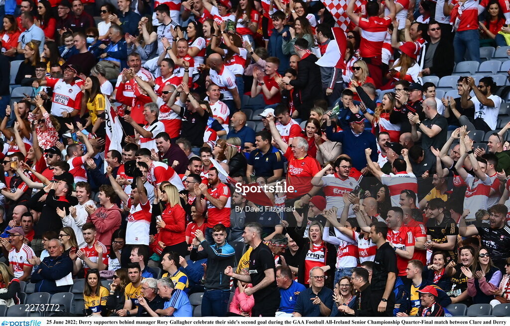 25 June 2022; Derry supporters behind manager Rory Gallagher celebrate their side's second goal during the GAA Football All-Ireland Senior Championship Quarter-Final match between Clare and Derry at Croke Park, Dublin. Photo by David Fitzgerald/Sportsfile