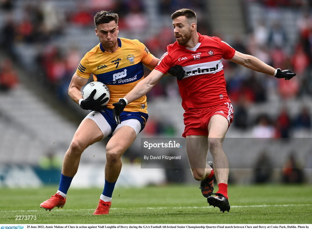 25 June 2022; Jamie Malone of Clare in action against Niall Loughlin of Derry during the GAA Football All-Ireland Senior Championship Quarter-Final match between Clare and Derry at Croke Park, Dublin. Photo by David Fitzgerald/Sportsfile