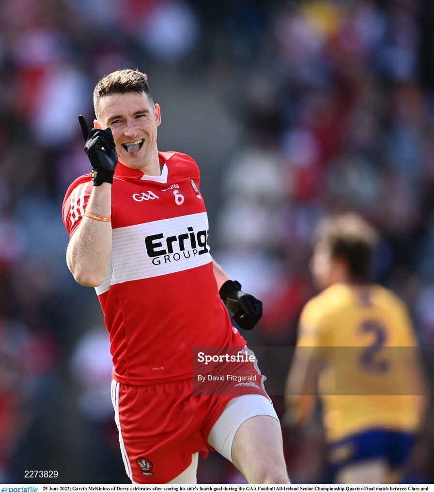 25 June 2022; Gareth McKinless of Derry celebrates after scoring his side's fourth goal during the GAA Football All-Ireland Senior Championship Quarter-Final match between Clare and Derry at Croke Park, Dublin. Photo by David Fitzgerald/Sportsfile