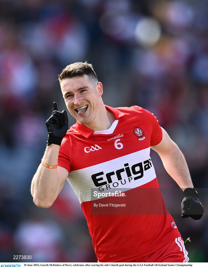 25 June 2022; Gareth McKinless of Derry celebrates after scoring his side's fourth goal during the GAA Football All-Ireland Senior Championship Quarter-Final match between Clare and Derry at Croke Park, Dublin. Photo by David Fitzgerald/Sportsfile