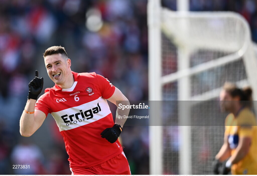 25 June 2022; Gareth McKinless of Derry celebrates after scoring his side's fourth goal during the GAA Football All-Ireland Senior Championship Quarter-Final match between Clare and Derry at Croke Park, Dublin. Photo by David Fitzgerald/Sportsfile