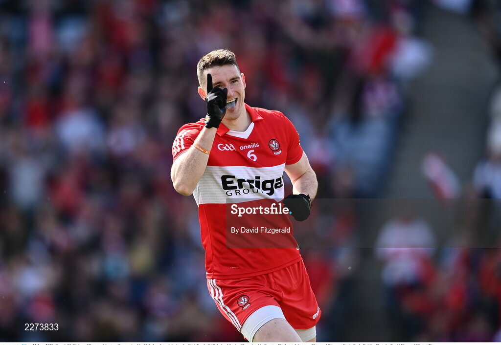 25 June 2022; Gareth McKinless of Derry celebrates after scoring his side's fourth goal during the GAA Football All-Ireland Senior Championship Quarter-Final match between Clare and Derry at Croke Park, Dublin. Photo by David Fitzgerald/Sportsfile