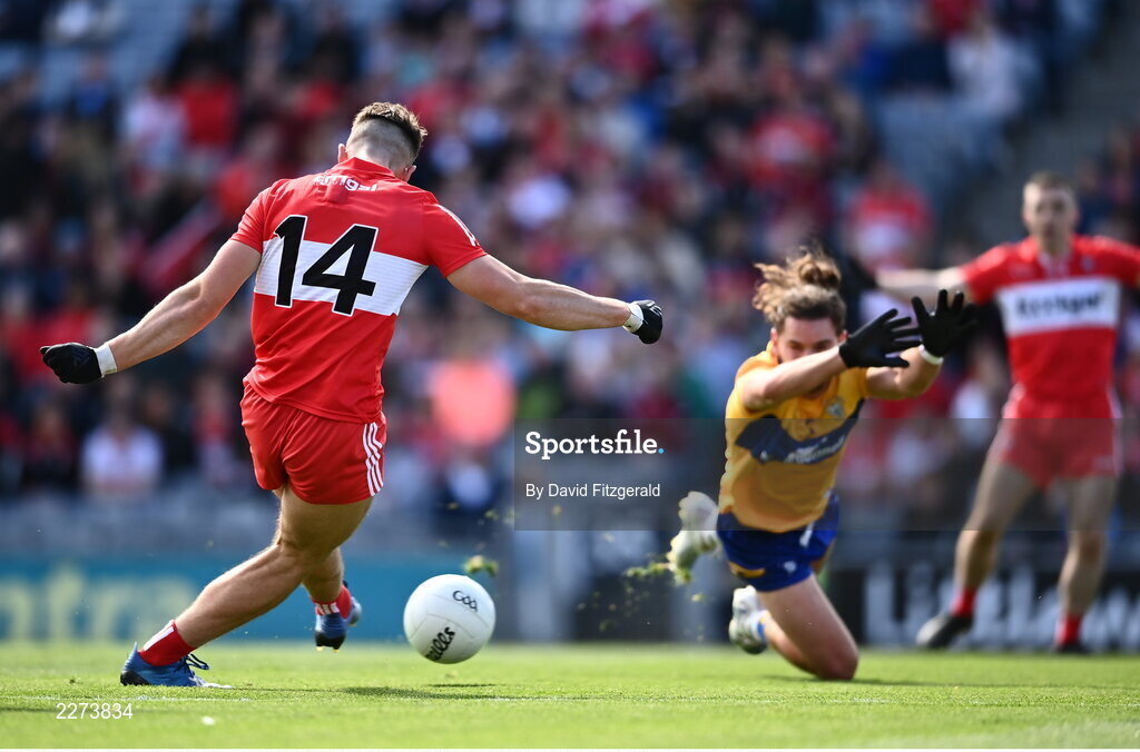 25 June 2022; Shane McGuigan of Derry shoots to score his side's fifth goal during the GAA Football All-Ireland Senior Championship Quarter-Final match between Clare and Derry at Croke Park, Dublin. Photo by David Fitzgerald/Sportsfile