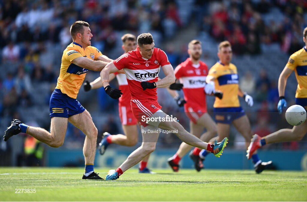 25 June 2022; Gareth McKinless of Derry shoots to score his side's fourth goal during the GAA Football All-Ireland Senior Championship Quarter-Final match between Clare and Derry at Croke Park, Dublin. Photo by David Fitzgerald/Sportsfile