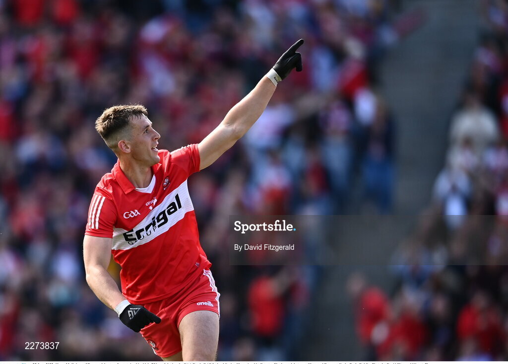 25 June 2022; Shane McGuigan of Derry celebrates after scoring his side's fifth goal during the GAA Football All-Ireland Senior Championship Quarter-Final match between Clare and Derry at Croke Park, Dublin. Photo by David Fitzgerald/Sportsfile