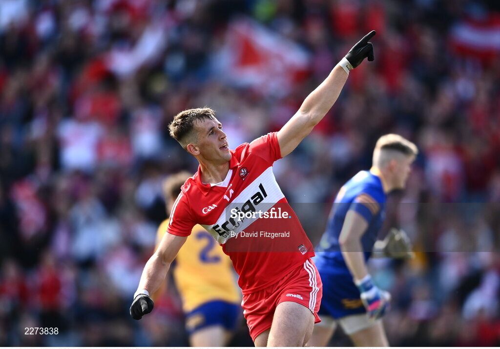 25 June 2022; Shane McGuigan of Derry celebrates after scoring his side's fifth goal during the GAA Football All-Ireland Senior Championship Quarter-Final match between Clare and Derry at Croke Park, Dublin. Photo by David Fitzgerald/Sportsfile