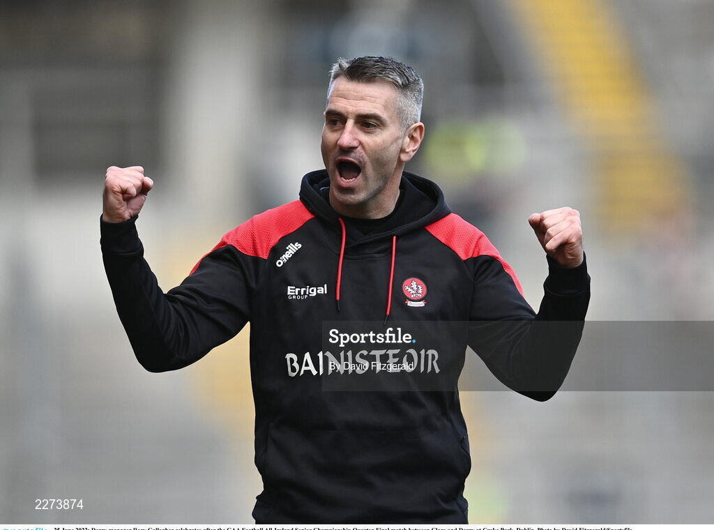 25 June 2022; Derry manager Rory Gallagher celebrates after the GAA Football All-Ireland Senior Championship Quarter-Final match between Clare and Derry at Croke Park, Dublin. Photo by David Fitzgerald/Sportsfile