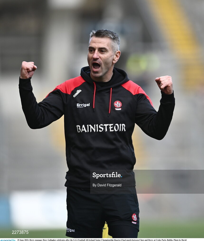 25 June 2022; Derry manager Rory Gallagher celebrates after the GAA Football All-Ireland Senior Championship Quarter-Final match between Clare and Derry at Croke Park, Dublin. Photo by David Fitzgerald/Sportsfile