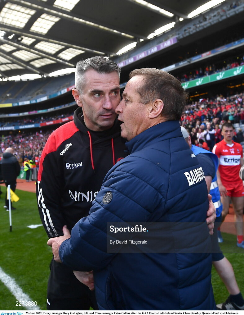 25 June 2022; Derry manager Rory Gallagher, left, and Clare manager Colm Collins after the GAA Football All-Ireland Senior Championship Quarter-Final match between Clare and Derry at Croke Park, Dublin. Photo by David Fitzgerald/Sportsfile