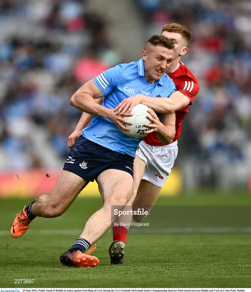 25 June 2022; Paddy Small of Dublin in action against Paul Ring of Cork during the GAA Football All-Ireland Senior Championship Quarter-Final match between Dublin and Cork at Croke Park, Dublin. Photo by David Fitzgerald/Sportsfile