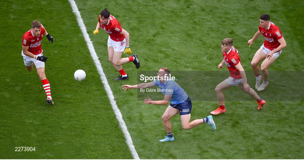 25 June 2022; Ciarán Kilkenny of Dublin in action against Cork players, left to right, Ian Maguire, Eoghan McSweeney, John Cooper, and Rory Maguire during the GAA Football All-Ireland Senior Championship Quarter-Final match between Dublin and Cork at Croke Park, Dublin. Photo by Daire Brennan/Sportsfile