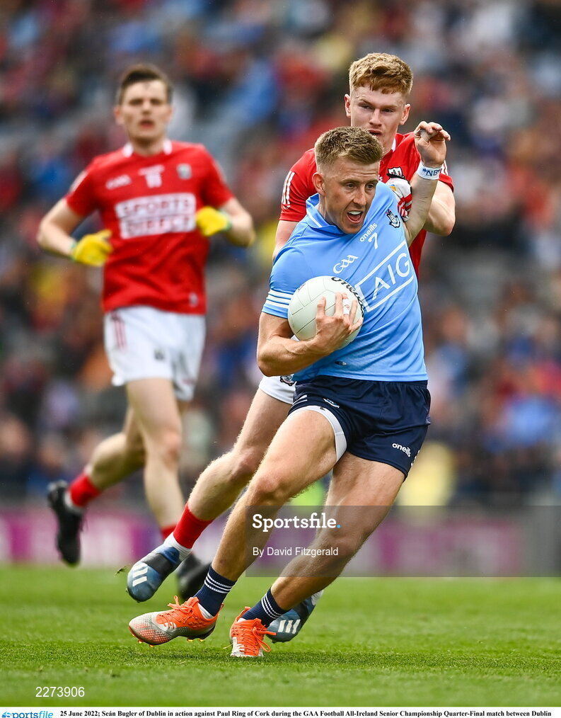 25 June 2022; Seán Bugler of Dublin in action against Paul Ring of Cork during the GAA Football All-Ireland Senior Championship Quarter-Final match between Dublin and Cork at Croke Park, Dublin. Photo by David Fitzgerald/Sportsfile