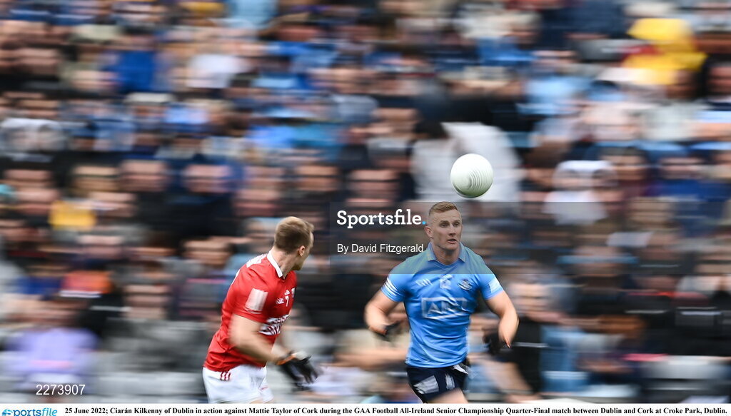 25 June 2022; Ciarán Kilkenny of Dublin in action against Mattie Taylor of Cork during the GAA Football All-Ireland Senior Championship Quarter-Final match between Dublin and Cork at Croke Park, Dublin. Photo by David Fitzgerald/Sportsfile