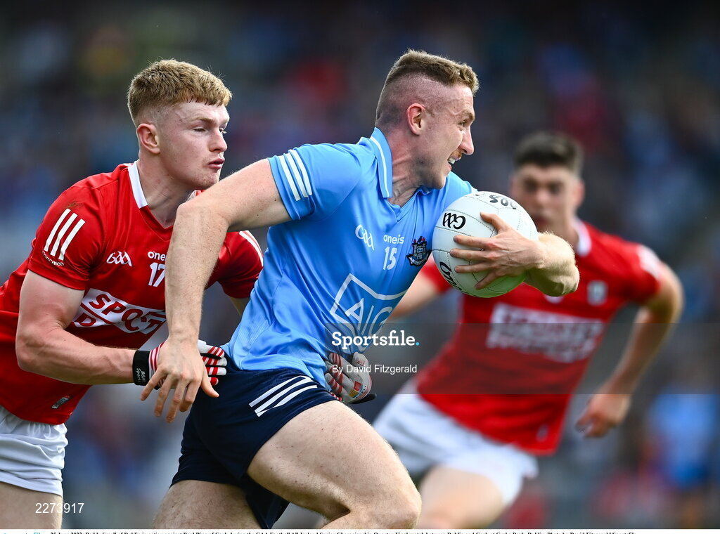 25 June 2022; Paddy Small of Dublin in action against Paul Ring of Cork during the GAA Football All-Ireland Senior Championship Quarter-Final match between Dublin and Cork at Croke Park, Dublin. Photo by David Fitzgerald/Sportsfile