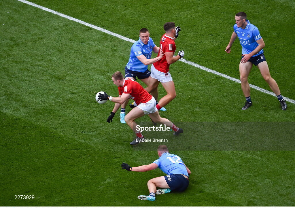 25 June 2022; Mattie Taylor of Cork breaks away from the challenge of John Small, left, and Ciarán Kilkenny of Dublin during the GAA Football All-Ireland Senior Championship Quarter-Final match between Dublin and Cork at Croke Park, Dublin. Photo by Daire Brennan/Sportsfile