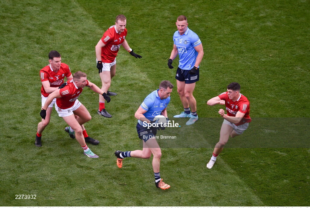 25 June 2022; Dean Rock of Dublin in action against Cork players, left to right, Maurice Shanley, Brian Hurley, Mattie Taylor, and Rory Maguire during the GAA Football All-Ireland Senior Championship Quarter-Final match between Dublin and Cork at Croke Park, Dublin. Photo by Daire Brennan/Sportsfile