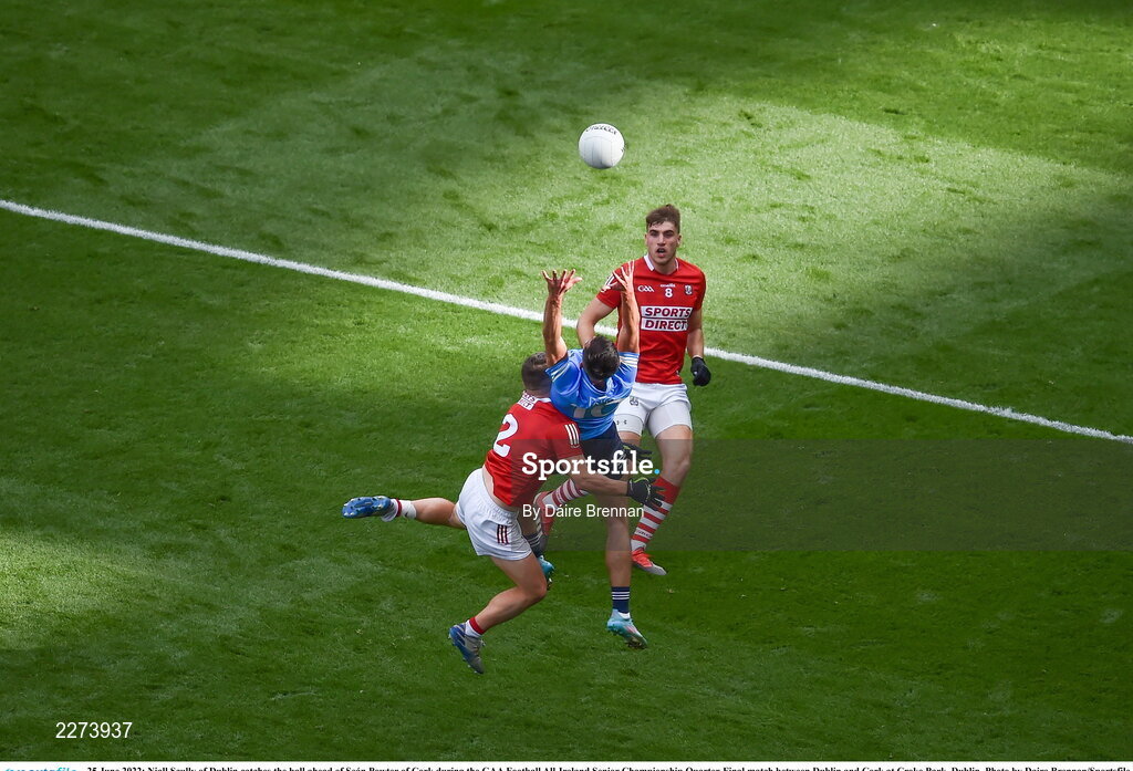 25 June 2022; Niall Scully of Dublin catches the ball ahead of Seán Powter of Cork during the GAA Football All-Ireland Senior Championship Quarter-Final match between Dublin and Cork at Croke Park, Dublin. Photo by Daire Brennan/Sportsfile