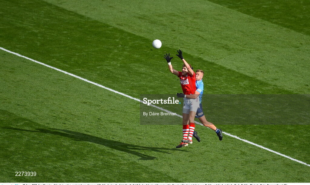 25 June 2022; Ian Maguire of Cork in action against Jonny Cooper of Dublin during the GAA Football All-Ireland Senior Championship Quarter-Final match between Dublin and Cork at Croke Park, Dublin. Photo by Daire Brennan/Sportsfile