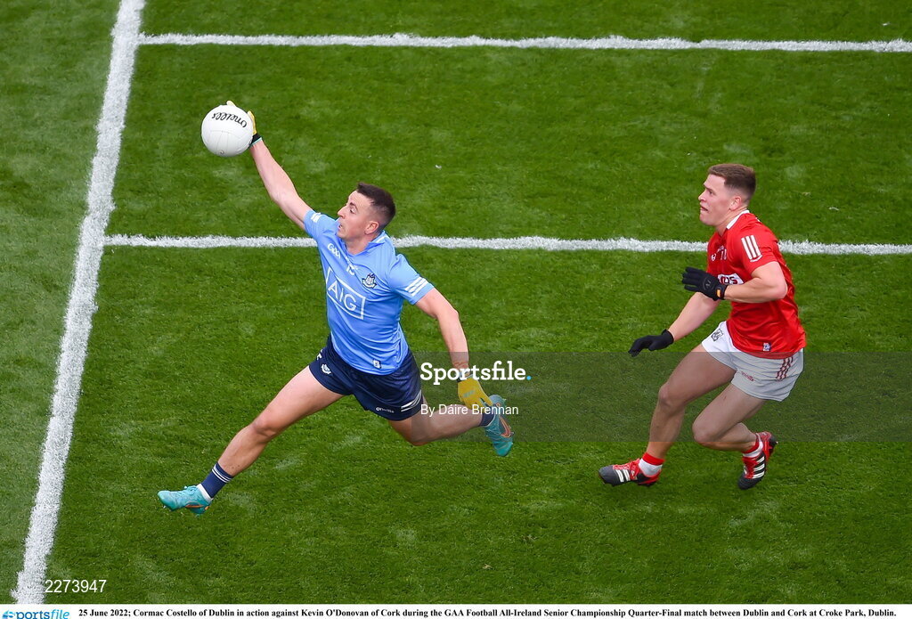 25 June 2022; Cormac Costello of Dublin in action against Kevin O'Donovan of Cork during the GAA Football All-Ireland Senior Championship Quarter-Final match between Dublin and Cork at Croke Park, Dublin. Photo by Daire Brennan/Sportsfile