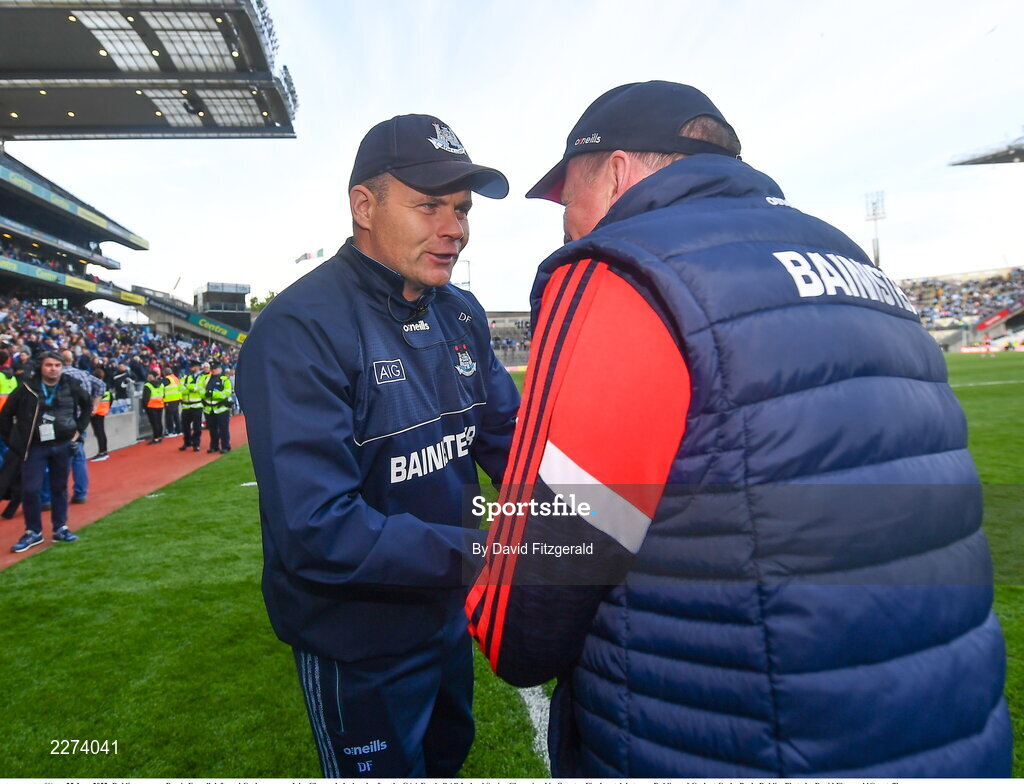 25 June 2022; Dublin manager Dessie Farrell, left, and Cork manager John Cleary shake hands after the GAA Football All-Ireland Senior Championship Quarter-Final match between Dublin and Cork at Croke Park, Dublin. Photo by David Fitzgerald/Sportsfile