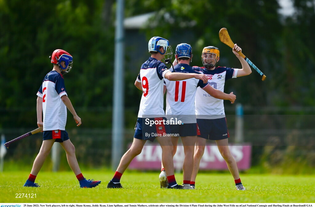 25 June 2022; New York players, left to right, Shane Kenny, Jeddy Ryan, Liam Spillane, and Tomás Mathers, celebrate after winning the Division 4 Plate Final during the John West Féile na nGael National Camogie and Hurling Finals at Boardsmill GAA Club in Meath. Photo by Daire Brennan/Sportsfile