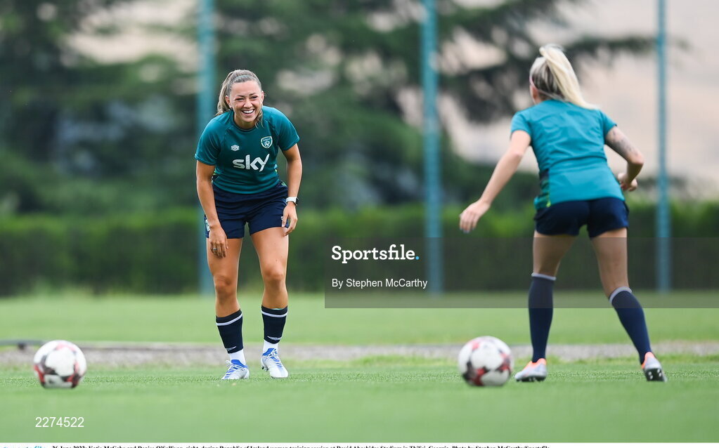 26 June 2022; Katie McCabe and Denise O'Sullivan, right, during Republic of Ireland women training session at David Abashidze Stadium in Tbilisi, Georgia. Photo by Stephen McCarthy/Sportsfile