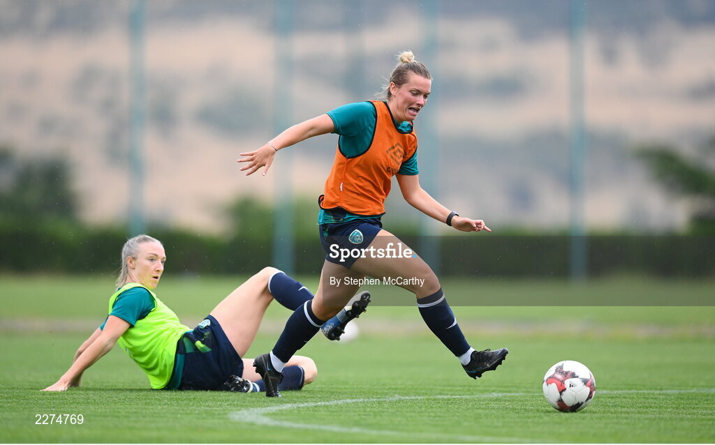 26 June 2022; Saoirse Noonan is tackled by Louise Quinn, left, during Republic of Ireland women training session at David Abashidze Stadium in Tbilisi, Georgia. Photo by Stephen McCarthy/Sportsfile