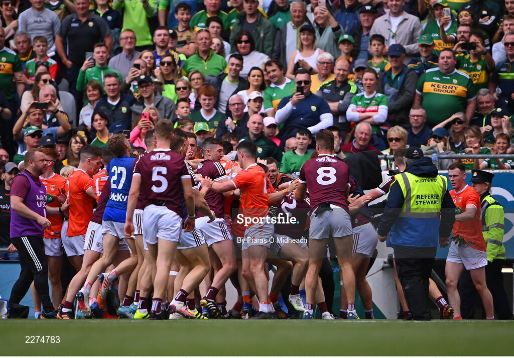 26 June 2022; Players and officials from both sides become embroiled as they make their way to the dressing rooms after full time ended in a draw at the GAA Football All-Ireland Senior Championship Quarter-Final match between Armagh and Galway at Croke Park, Dublin. Photo by Piaras Ó Mídheach/Sportsfile