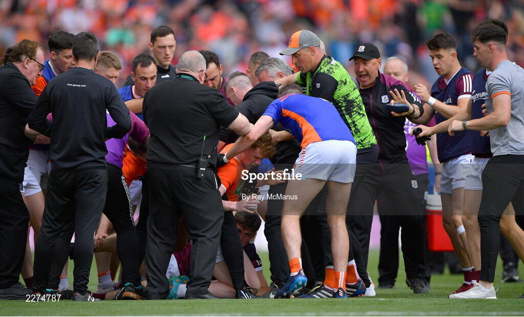 26 June 2022; Players and officials from both sides become embroiled as they make their way to the dressing rooms after full time ended in a draw at the GAA Football All-Ireland Senior Championship Quarter-Final match between Armagh and Galway at Croke Park, Dublin. Photo by Ray McManus/Sportsfile