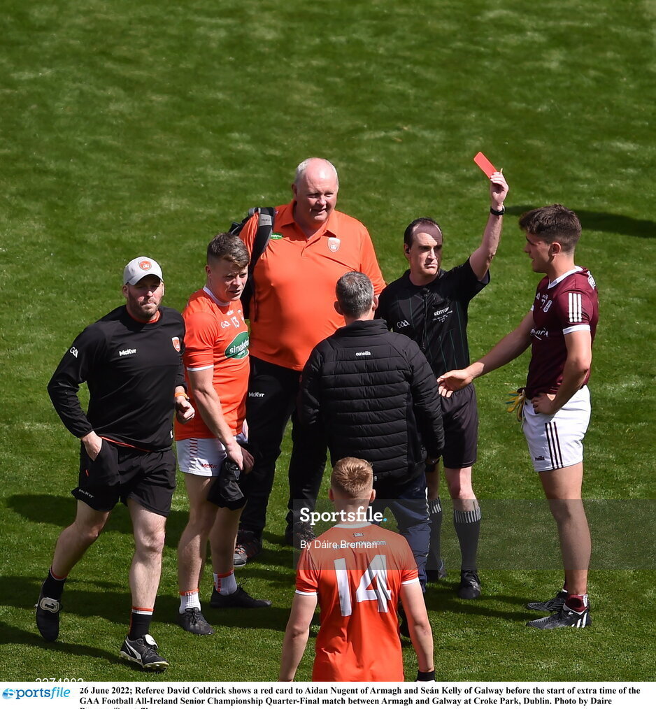 26 June 2022; Referee David Coldrick shows a red card to Aidan Nugent of Armagh and Seán Kelly of Galway before the start of extra time of the GAA Football All-Ireland Senior Championship Quarter-Final match between Armagh and Galway at Croke Park, Dublin. Photo by Daire Brennan/Sportsfile