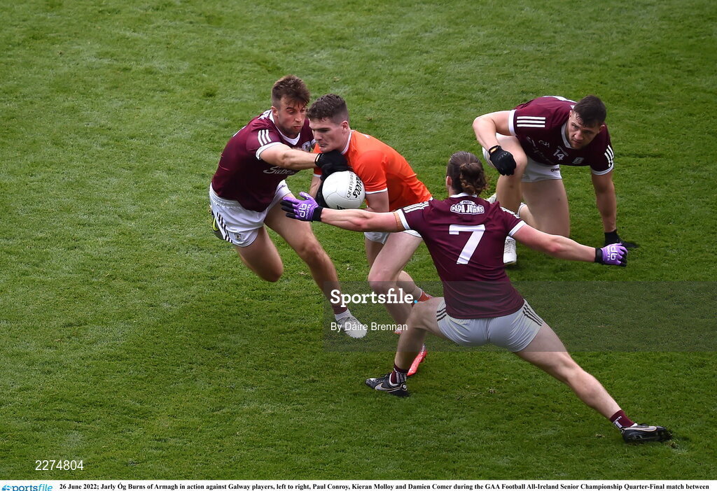 26 June 2022; Jarly Óg Burns of Armagh in action against Galway players, left to right, Paul Conroy, Kieran Molloy and Damien Comer during the GAA Football All-Ireland Senior Championship Quarter-Final match between Armagh and Galway at Croke Park, Dublin. Photo by Daire Brennan/Sportsfile