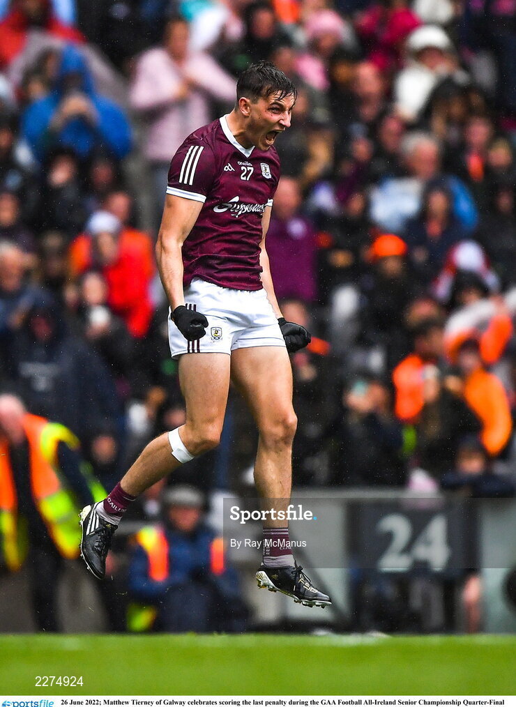 26 June 2022; Matthew Tierney of Galway celebrates scoring the last penalty during the GAA Football All-Ireland Senior Championship Quarter-Final match between Armagh and Galway at Croke Park, Dublin. Photo by Ray McManus/Sportsfile