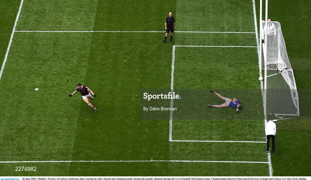 26 June 2022; Matthew Tierney of Galway celebrates after scoring his side's fourth and winning penalty during the penalty shootout during the GAA Football All-Ireland Senior Championship Quarter-Final match between Armagh and Galway at Croke Park, Dublin. Photo by Daire Brennan/Sportsfile