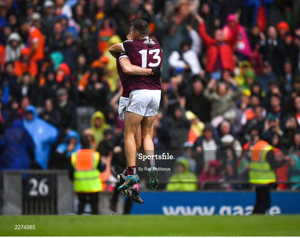 26 June 2022; Matthew Tierney and Robert Finnerty, 13, of Galway celebrate Matthew scoring the last penalty during the GAA Football All-Ireland Senior Championship Quarter-Final match between Armagh and Galway at Croke Park, Dublin. Photo by Ray McManus/Sportsfile